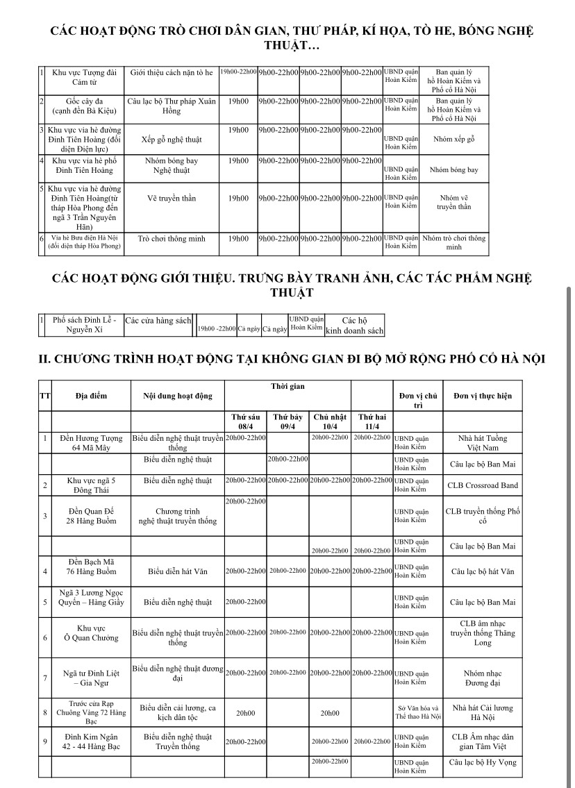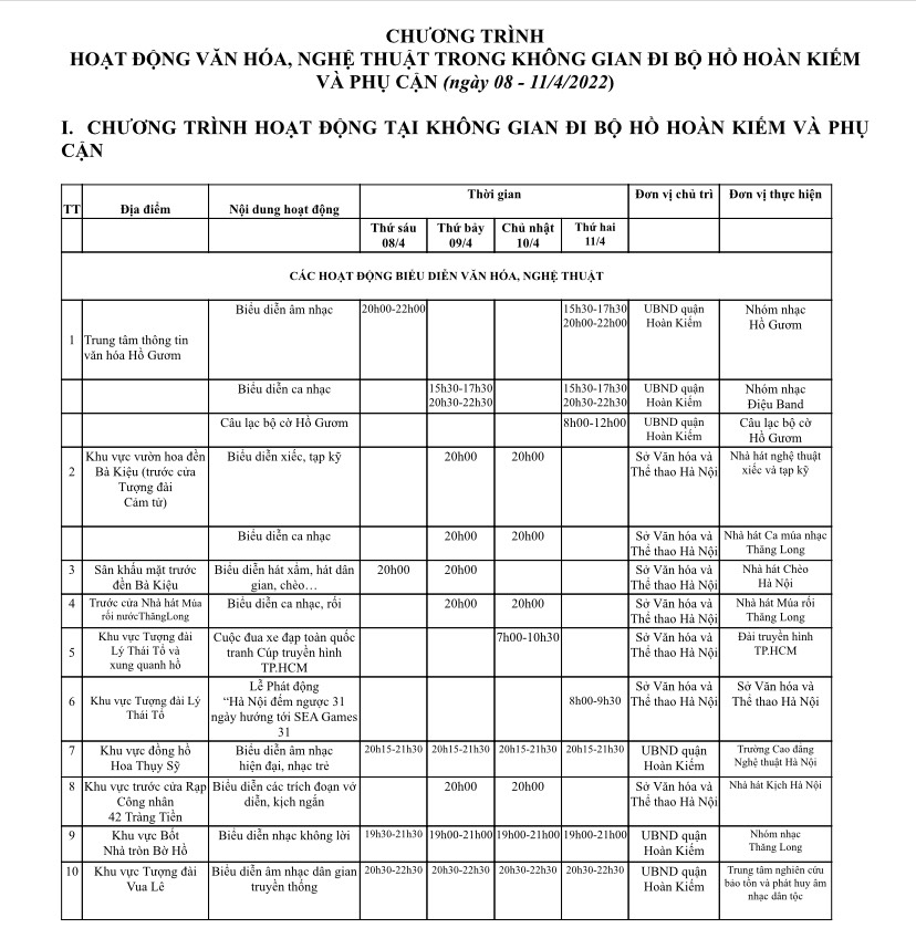 Do dịp lễ Giỗ Tổ năm nay trùng vào ngày cuối tuần, nên rất nhiều hoạt động đặc sắc sẽ được tổ chức tại không gian đi bộ khu vực hồ Hoàn Kiếm và phụ cận. Cụ thể, trong dịp nghỉ lễ Giỗ Tổ Hùng Vương 2022(10 tháng Ba), thời gian hoạt động của không gian đi bộ hồ Hoàn Kiếm và phụ cận là từ 19h ngày 08/4 (thứ sáu) đến 24h ngày 11/4 (thứ hai).