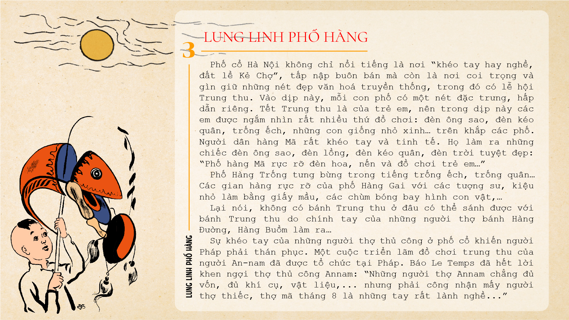 Phố cổ Hà Nội không chỉ nổi tiếng là nơi “khéo tay hay nghề, đất lề Kẻ Chợ”, tấp nập buôn bán mà còn là nơi coi trọng và gìn giữ những nét đẹp văn hoá truyền thống, trong đó có lễ hội Trung thu. Vào dịp này, mỗi con phố có một nét đặc trưng, hấp dẫn riêng. Tết Trung thu là của trẻ em, nên trong dịp này các em được ngắm nhìn rất nhiều thứ đồ chơi: đèn ông sao, đèn kéo quân, trống ếch, những con giống nhỏ xinh… trên khắp các phố. Người dân hàng Mã rất khéo tay và tinh tế. Họ làm ra những chiếc đèn ông sao, đèn lồng, đèn kéo quân, đèn trời tuyệt đẹp: “Phố hàng Mã rực rỡ đèn hoa, nến và đồ chơi trẻ em…” Phố Hàng Trống tưng bừng trong tiếng trống ếch, trống quân…Các gian hàng rực rỡ của phố Hàng Gai với các tượng sư, kiệu nhỏ làm bằng giấy mầu, các chùm bóng bay hình con vật,…Lại nói, không có bánh Trung thu ở đâu có thể sánh được với bánh Trung thu do chính tay của những người thợ bánh Hàng Đường, Hàng Buồm làm ra…Sự khéo tay của những người thợ thủ công ở phố cổ khiến người Pháp phải thán phục. Một cuộc triển lãm đồ chơi trung thu của người An-nam đã được tổ chức tại Pháp. Báo Le Temps đã hết lời khen ngợi thợ thủ công Annam: “Những người thợ Annam chẳng đủ vốn, đủ khí cụ, vật liệu,... nhưng phải công nhận mấy người thợ thiếc, thợ mã tháng 8 là những tay rất lành nghề...”