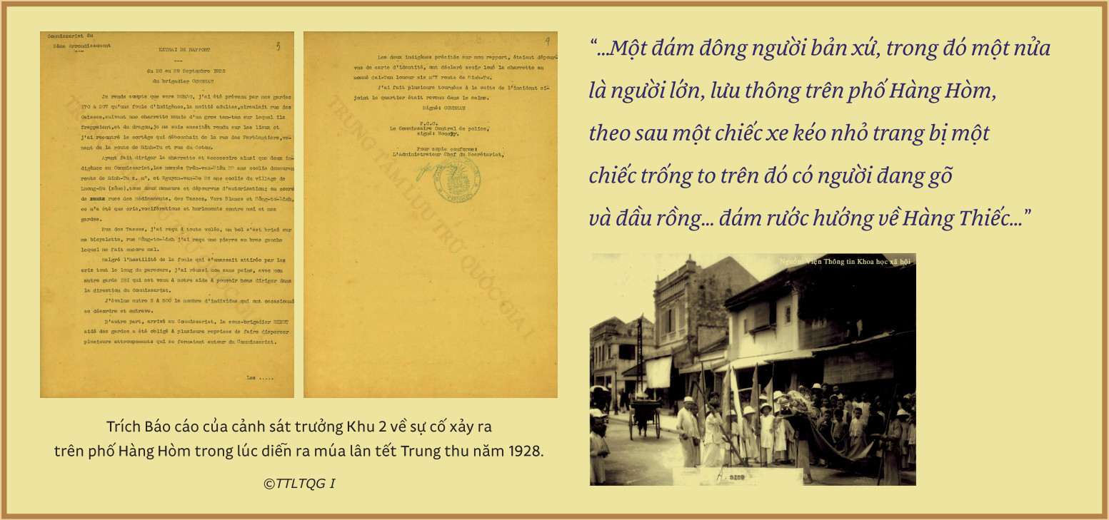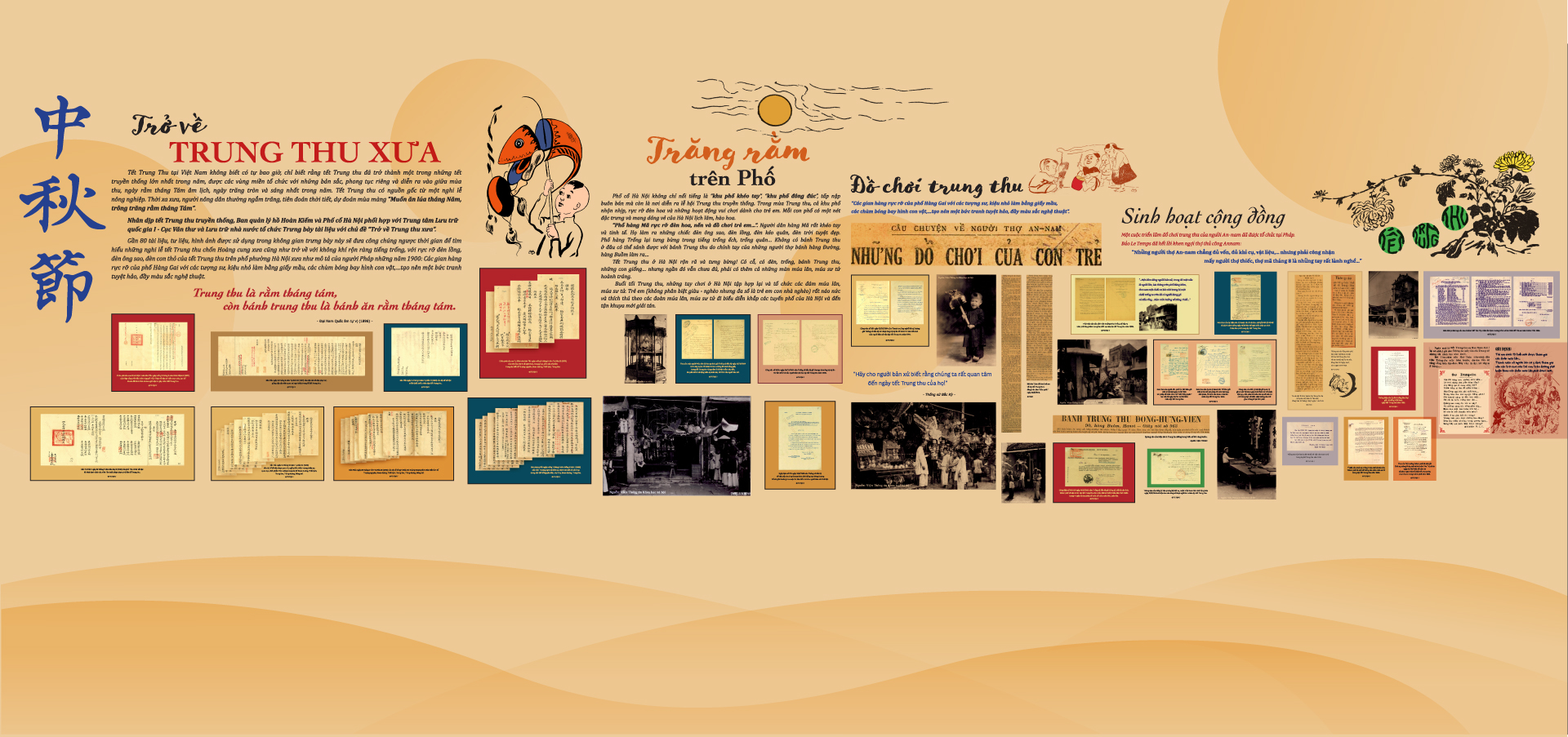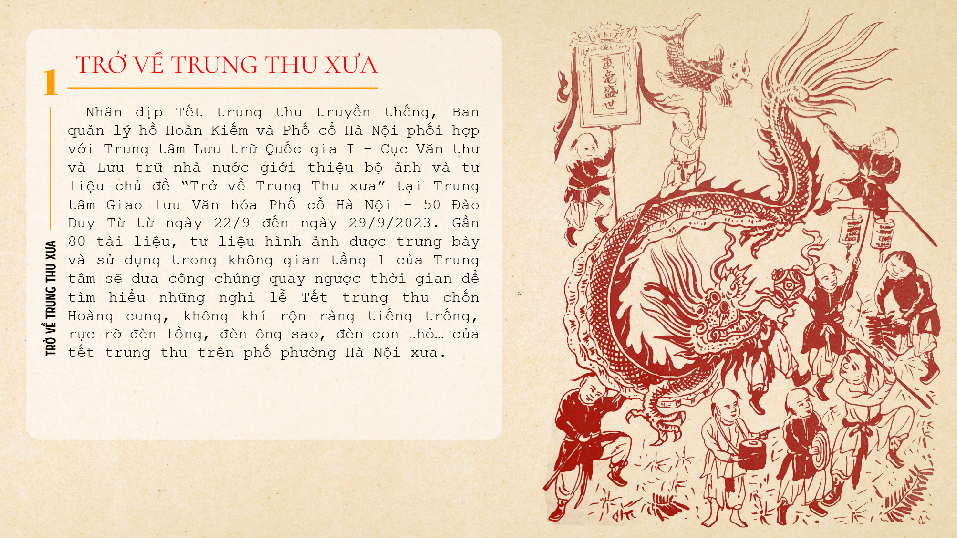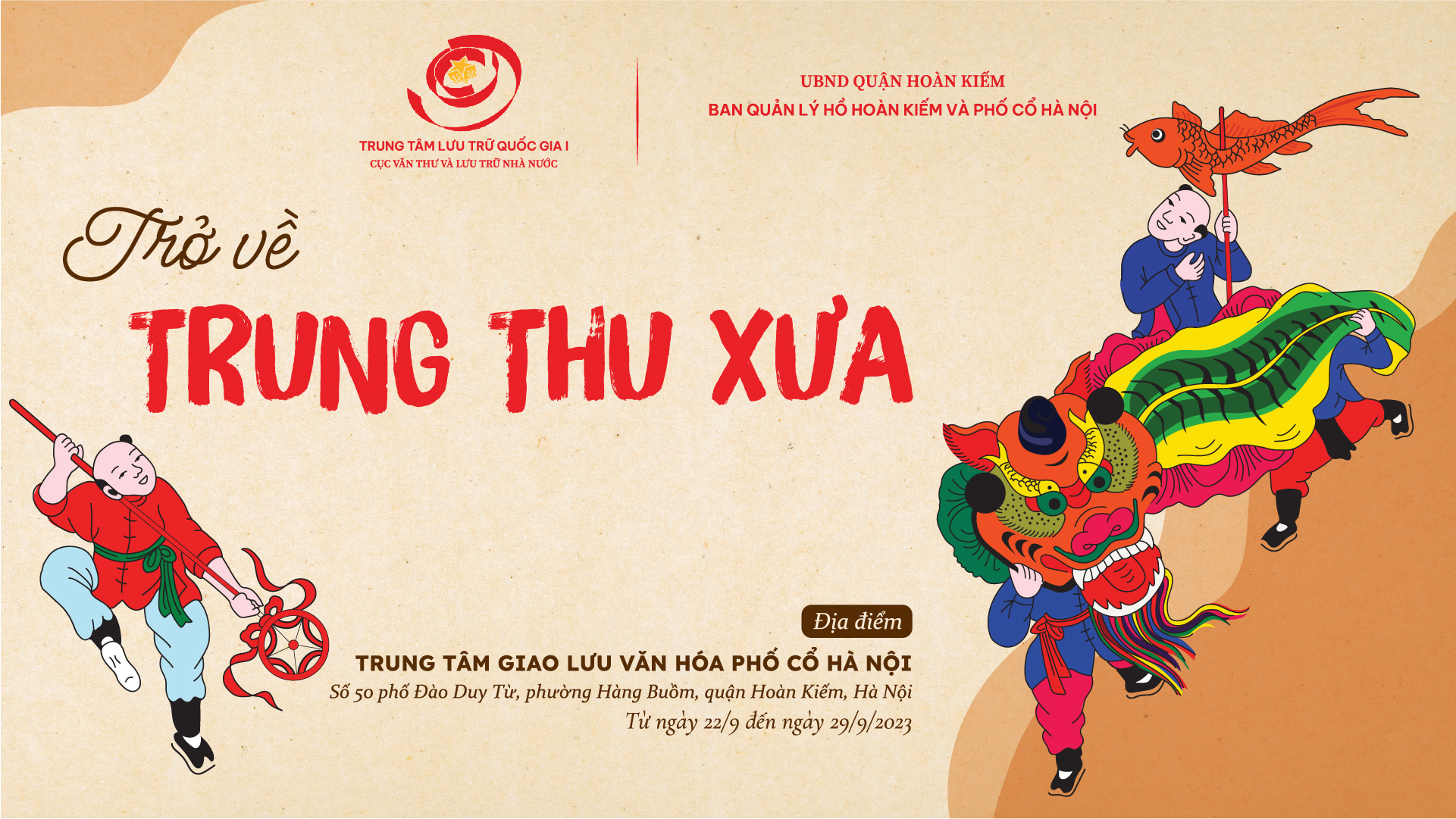 Nhân dịp Tết trung thu truyền thống, Ban quản lý hồ Hoàn Kiếm và Phố cổ Hà Nội phối hợp với Trung tâm Lưu trữ Quốc gia I - Cục Văn thư và Lưu trữ nhà nước giới thiệu bộ ảnh và tư liệu chủ đề “Trở về Trung Thu xưa” tại Trung tâm Giao lưu Văn hóa Phố cổ Hà Nội - 50 Đào Duy Từ từ ngày 22/9 đến ngày 29/9/2023. Gần 80 tài liệu, tư liệu hình ảnh được trưng bày và sử dụng trong không gian tầng 1 của Trung tâm sẽ đưa công chúng quay ngược thời gian để tìm hiểu những nghi lễ Tết trung thu chốn Hoàng cung, không khí rộn ràng tiếng trống, rực rỡ đèn lồng, đèn ông sao, đèn con thỏ… của tết trung thu trên phố phường Hà Nội xưa.