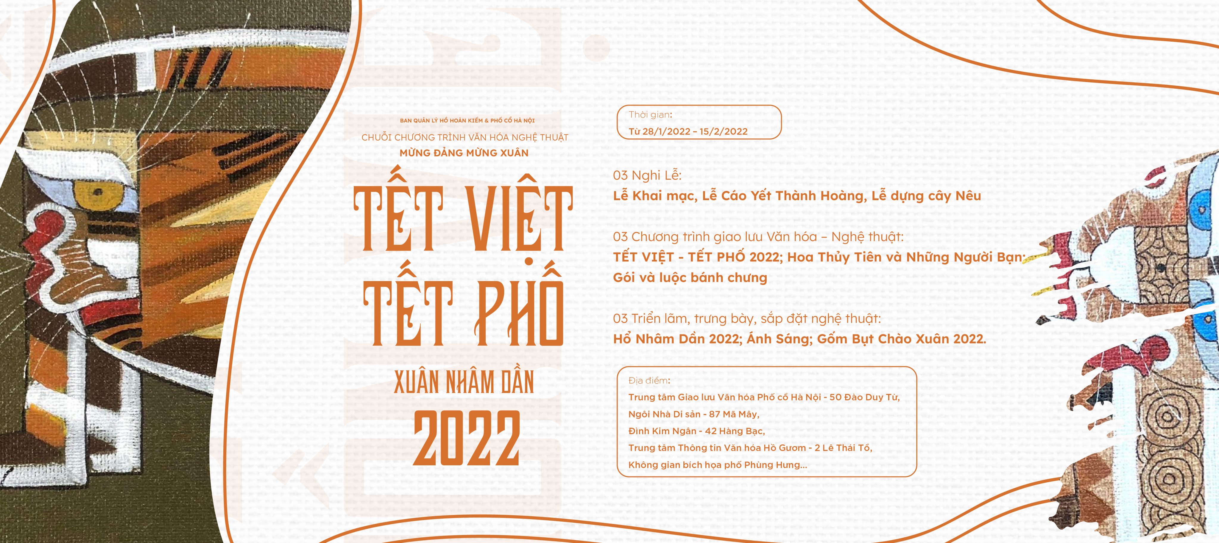 Với chủ đề ‘Tết Việt – Tết Phố Xuân Nhâm Dần 2022’ Ban quản lý Hồ Hoàn Kiếm và Phố cổ Hà Nội phối hợp cùng các đơn vị, cá nhân tổ chức chuỗi hoạt động văn hóa nghệ thuật Mừng Đảng Mừng Xuân 2022 từ ngày 28/01/2022 đến ngày 15/02/2022 (tức 26 tháng Chạp đến hết 15 tháng Giêng năm Nhâm Dần)